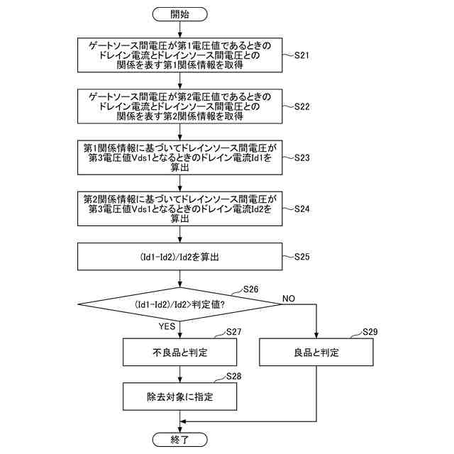 【解決手段】半導体装置の製造方法において、チップを検査する工程は、電界効果トランジスタのゲートソース間電圧が第1電圧値であるときのドレイン電流とドレインソース間電圧との関係を表す第1関係情報を取得する工程と、ゲートソース間電圧が第1電圧値よりも小さい第2電圧値であるときのドレイン電流とドレインソース間電圧との関係を表す第2関係情報を取得する工程と、第1関係情報に基づいてドレインソース間電圧が第3電圧値となるときの前記ドレイン電流である第1電流値を算出する工程と、第2関係情報に基づいてドレインソース間電圧が第3電圧値となるときのドレイン電流である第2電流値を算出する工程と、(Id1-Id2)/Id2により算出される算出値が判定値よりも大きい場合に不良品であると判定する工程と、を有する。