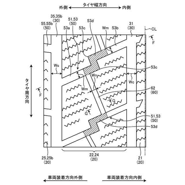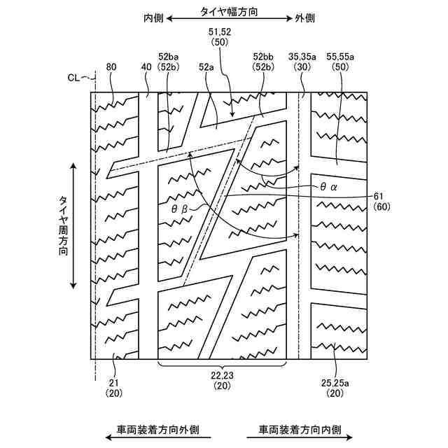車両に装着されるタイヤには、タイヤの使用態様に応じた様々な性能の確保等を目的としてトレッド部に溝が形成されており、溝の形状を工夫することにより、性能の向上を図っている。例えば、特許文献1に記載された空気入りタイヤは、タイヤ赤道よりも車両外側に長片部と短片部とから形成されるジグザグ状のセンター外側主溝が設けられ、センター外側主溝の長片部と短片部との交差部には、センター横溝とミドル外側横溝の端部が連なっている。