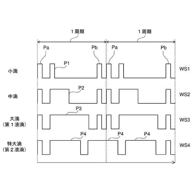 図4は、インクから成る様々の液滴を吐出するためにアクチュエータに入力される吐出信号の例を示す模式図である。