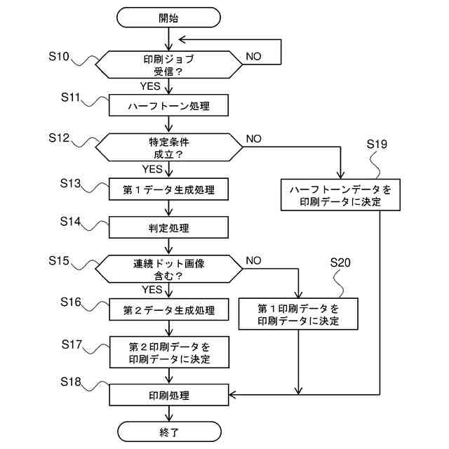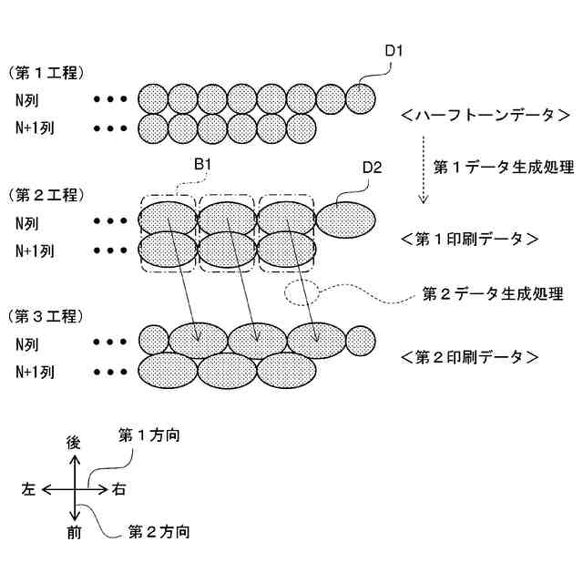 前記ノズルから吐出する液滴の種類として所定の第1液滴および前記第1液滴よりも吐出方向寸法が長く容量が大きい第2液滴のうち少なくとも前記第2液滴を指定する情報を含む第1印刷データにより印刷した場合に形成される被印刷媒体上の画像に、前記第2液滴が着弾して形成される前記第1方向に長寸のドットが前記第1方向に交差する第2方向に連続して配置される連続ドット画像を含む場合には、前記連続ドット画像を形成する一方の前記第2液滴の被印刷媒体上の着弾位置、および、他方の前記第2液滴の被印刷媒体上の着弾位置が、前記第1印刷データよりも前記第1方向に離れるように配置された第2印刷データを、画像データに基づいて生成する生成処理と、