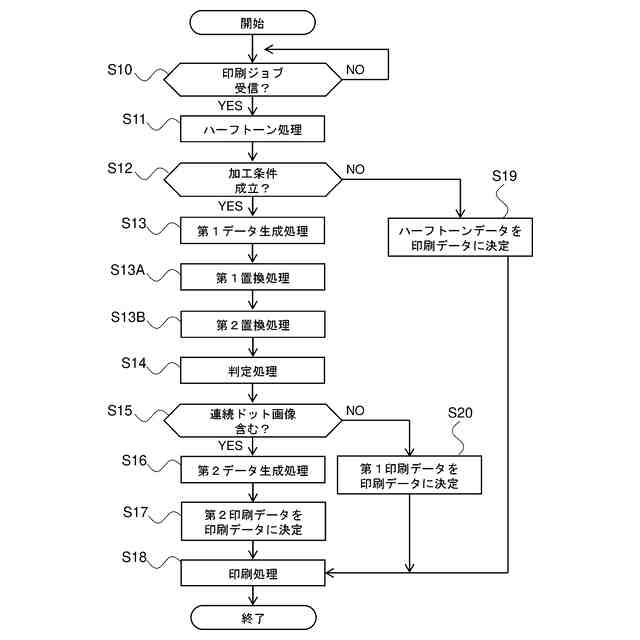 前記第1印刷データにおいて、画像の前記第1方向の端部に前記第2液滴が位置している場合には、当該第2液滴を複数の前記第1液滴に置換する第1置換処理、を実行する、