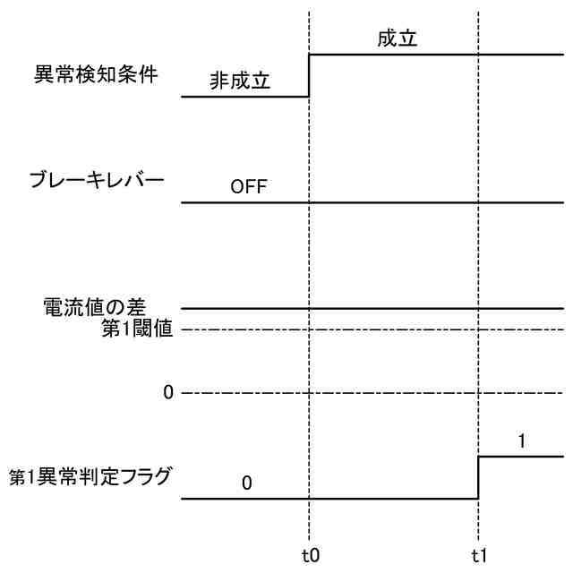 図5は、第1異常が生じている場合の異常検知条件の成立状態、ブレーキレバーの操作状態、電流値の差、および、第1異常判定フラグの状態を示すタイムチャートである。