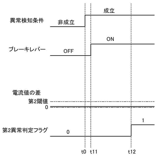 図6は、第2異常が生じている場合の異常検知条件の成立状態、ブレーキレバーの操作状態、電流値の差、および、第2異常判定フラグの状態を示すタイムチャートである。