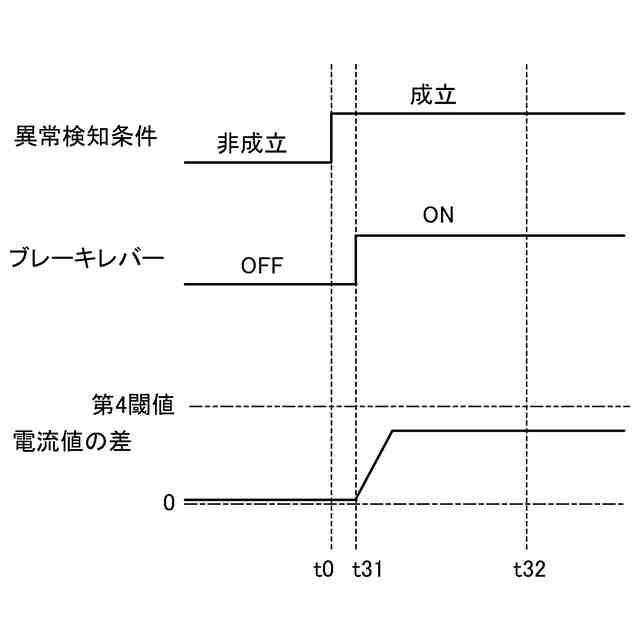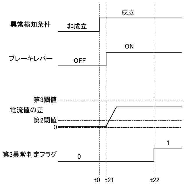 図7は、第3異常が生じている場合の異常検知条件の成立状態、ブレーキレバーの操作状態、電流値の差、および、第3異常判定フラグの状態を示すタイムチャートである。