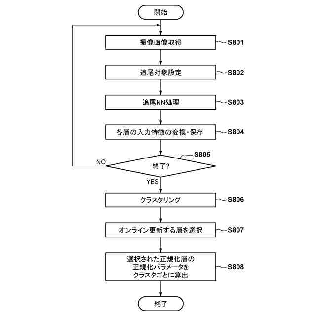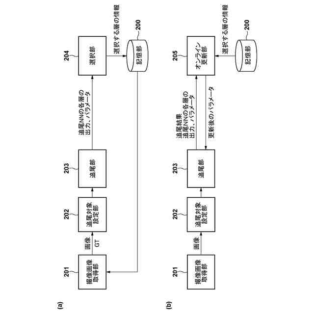 近年、ディープニューラルネットワーク(DNN)のオンライン学習を利用した追尾技術(オンライン追尾手法)が、特定の被写体を高精度に追尾するための技術として注目を集めている。オンライン追尾手法では、追尾中に得られる追尾対象物体の画像を用いて、物体検出DNNのパラメータを追尾対象の検出タスクに適合させる手法である。例えば、非特許文献1、2では、物体検出DNNのパラメータを、参照画像を用いて勾配法でfine-tuningする技術が提案されている。これにより、追尾対象物体の情報が物体検出DNNに取り込まれ、追尾対象物体をより高い精度で検出できるようになる。