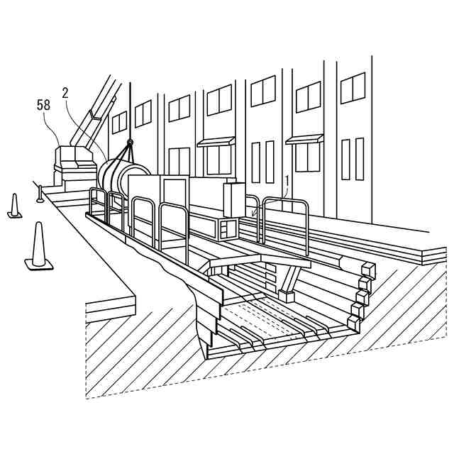 従来より、管渠の運搬接合する管渠接合工法が知られている。この種の管渠接合工法は、まず接合しようとする管渠101が立坑から降ろされた後に、管運搬台車を管渠101内に乗り込ませ、そして、管運搬台車の支持梁107が前油圧ジャッキ105と後油圧ジャッキ106を用いて持ち上げられることにより、管渠101をかつぎあげることができる(図18参照)。そして、管渠101が所定の高さまで持ち上げられた後は、バッテリー機関車114で押され、奥の既に固定された管渠111の所まで運搬される。そして、管渠101が固定されている管渠111の所まで到着したタイミングで、バッテリー機関車114を一定の速度まで減速させて、管渠101と管渠111を接合させる。このようにして、管渠101と管渠111との接合が完了すれば、管運搬台車が管渠101から引き抜かれ、管運搬台車を最初の立坑の所まで移動させ、上述した手順が繰り返し行われることにより、管渠が複数個接合され、その複数個接合された管渠より長い管渠を生成することができるというものであった(たとえば、特許文献1)。ここで、 図18は従来の管運搬台車が管渠を運搬して、接合のために乗り込もうとしている状態を示す側面図である。また、特許文献1の内容は、管渠に限定した内容でないが、本願発明の説明の都合上、管渠接合工法として説明する。