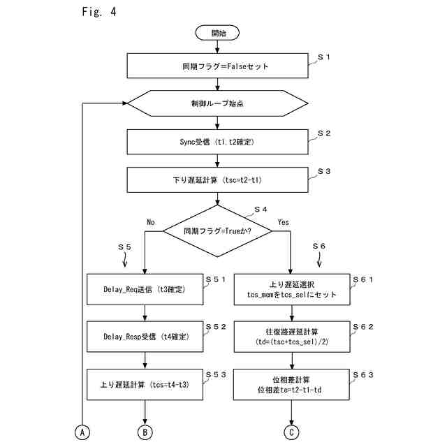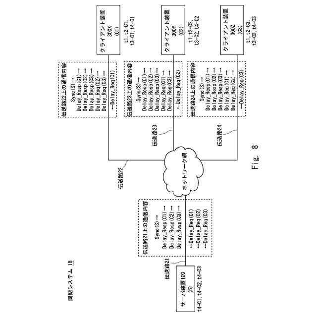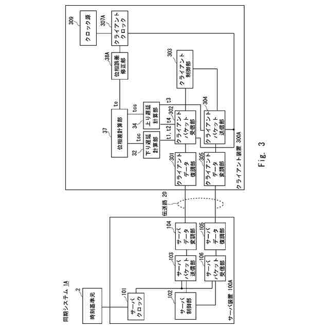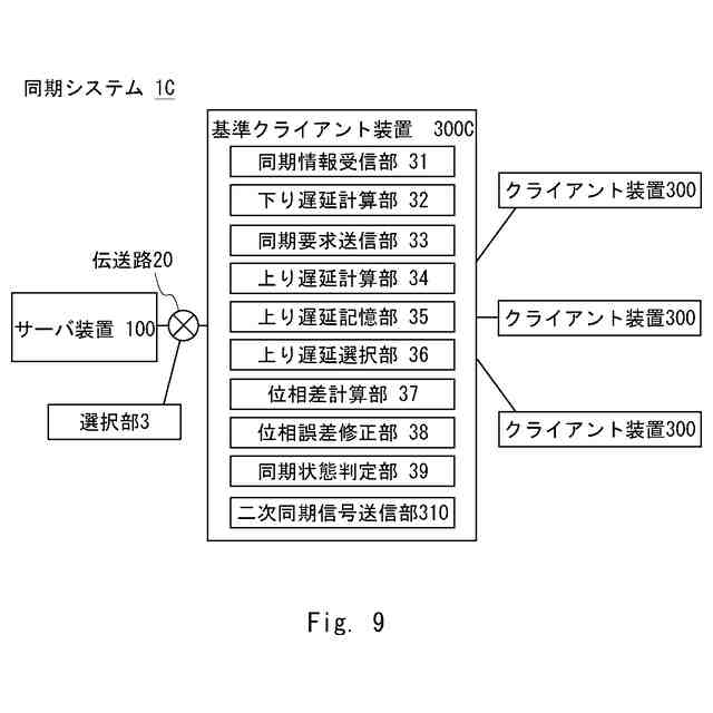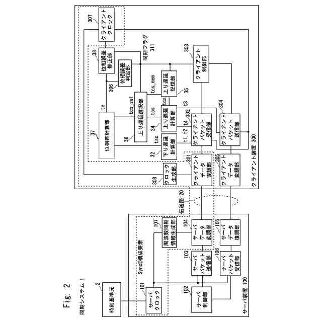 【解決手段】同期装置は、同期情報受信部と、下り遅延計算部と、同期要求送信部と、上り遅延計算部と、上り遅延記憶部と、上り遅延選択部と、位相差計算部と、位相誤差修正部と、同期状態判別部と、を備える。上り遅延記憶部は、上り遅延計算部が出力する上り遅延を記憶する。上り遅延選択部は、上り遅延計算部の出力又は上り遅延記憶部の出力を選択して出力する。位相差計算部は、下り遅延と上り遅延選択部の出力に基づき同期信号源とクライアントクロックとの位相差を計算する。状態判別部は、位相差に基づき同期信号源とクライアントクロックとの同期状態を出力する。
