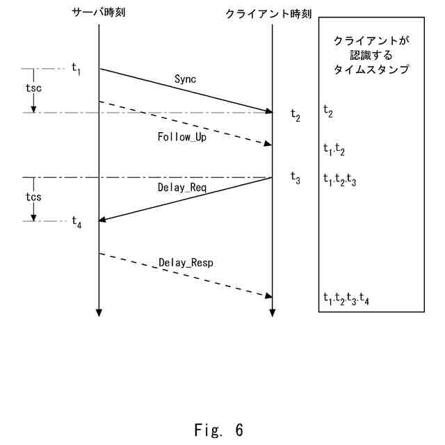 特許文献1によれば、周波数・時刻同期方法は、パケットネットワークを介して接続される装置間において、上位側の装置は、標準周波数に同期する周波数情報を含む信号上に標準時刻に同期する時刻情報を含む時刻同期パケットを重畳して伝送する。信号を受信する下位側の装置は、周波数情報を抽出して自装置内の時刻のカウントアップに使用し、時刻同期パケットの時刻情報を用いて自装置の時刻を設定する。