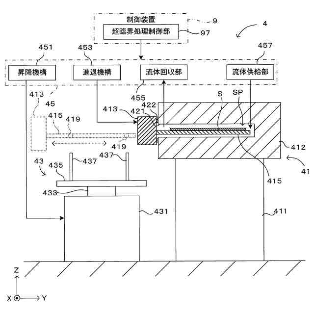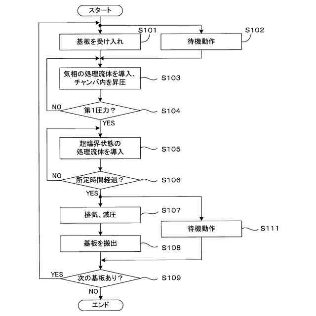 半導体基板、表示装置用ガラス基板等の各種基板の処理工程には、基板の表面を各種の処理流体によって処理するものが含まれる。処理流体として薬液やリンス液などの液体を用いる湿式処理が従来から広く行われている。近年では、当該湿式処理後の基板を乾燥させるために、超臨界状態の処理流体を用いた処理も実用化されている。特に、微細パターンが形成されたパターン形成面を有する基板の乾燥処理においては、有益である。というのも、超臨界状態の処理流体は、液体に比べて表面張力が低く、パターンの隙間の奥まで入り込むという特性を有しているからである。当該処理流体を用いることで、効率よく乾燥処理を行うことが可能である。また、乾燥時において表面張力に起因するパターン倒壊の発生リスクを低減させることも可能である。