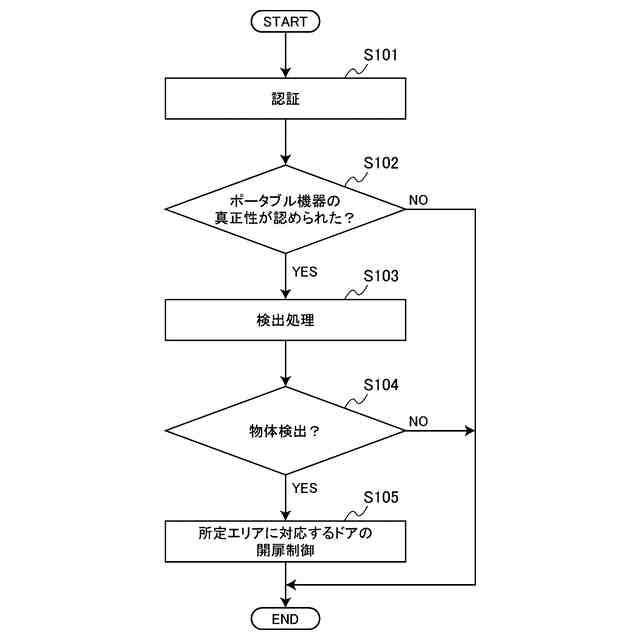 前記制御することは、前記移動体に備えられる無線通信装置とポータブル機器との間における規定の通信規格に準拠した無線通信に基づく認証において前記ポータブル機器の真正性が認められた場合、所定エリアにおける物体の検出処理を開始させ、前記所定エリアにおいて物体が検出された場合、前記被制御装置による規定の動作が実行されるよう制御すること、
