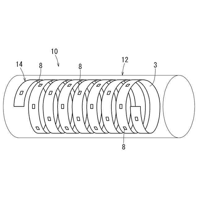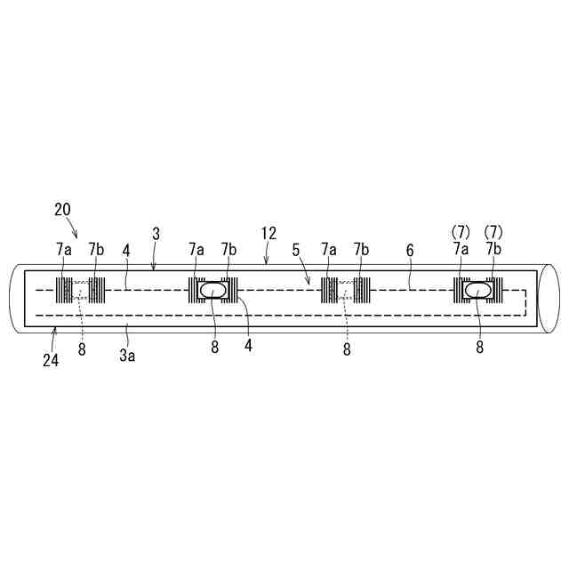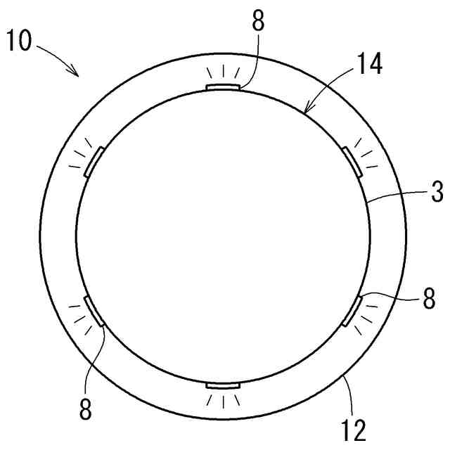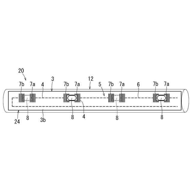 上記構成の一つの特徴及び利点は、発光基布は、柔軟性を備えた帯状基布の少なくとも一方の面に電気回路図が構成され、電気回路図上に複数の発光素子が配設されている。保護材の内部に発光基布を螺旋状に捻じれた状態で配設することにより、発光素子が保護材の長手方向中心軸から多方向を向くように配置され、保護材の周方向における発光範囲をより広くできる。