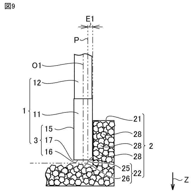 実施の形態3に係る工具の表面をキャビティ面の角部および底面に連続的に押し当てている状態を示す部分断面模式図である。