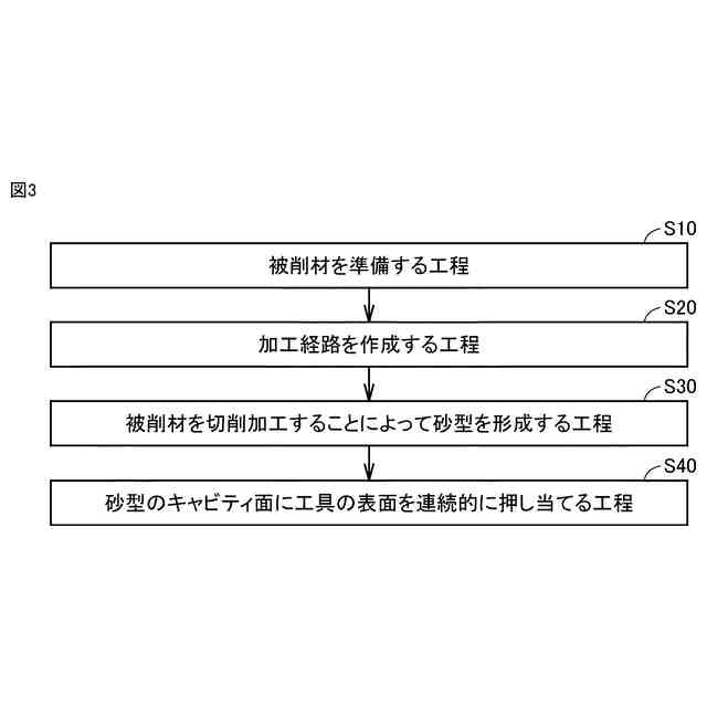 【解決手段】鋳造用砂型100の製造方法は、以下の工程を備えている。鋳物砂によって構成されている被削材9を切削加工することによって、キャビティ29が設けられている砂型2が形成される。キャビティ29を構成している砂型2のキャビティ面22に工具1の表面3が連続的に押し当てられる。