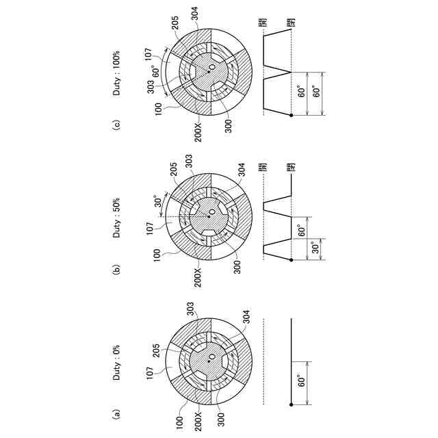 上記非特許文献1は、パイロット弁としての電磁弁のPWM制御により主弁としてのシート弁の開度を制御することを開示している。非特許文献1で開示された制御弁では、PWM制御によって直接制御されるのはパイロット弁としての電磁弁だけであり、このパイロット弁により主弁としてのシート弁の開度を制御することで流量が制御される。このように,PWM制御が可能な電磁弁による油圧制御弁としては、その電磁ソレノイドの駆動力の制約から、パイロット弁等の小流量の用途に限定されて、主弁のような大流量の制御は実現が困難である。また、非特許文献1は、回転スプール式の油圧制御弁に関しては開示していない。発明者は、回転スプール式の油圧制御弁のPWM制御をシンプルな構成で実現すべく鋭意検討を行い、本開示の油圧PWM制御弁を実現した。