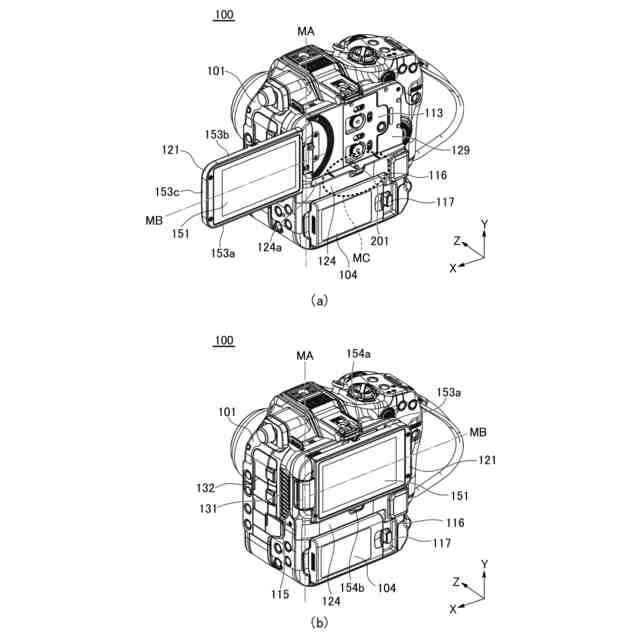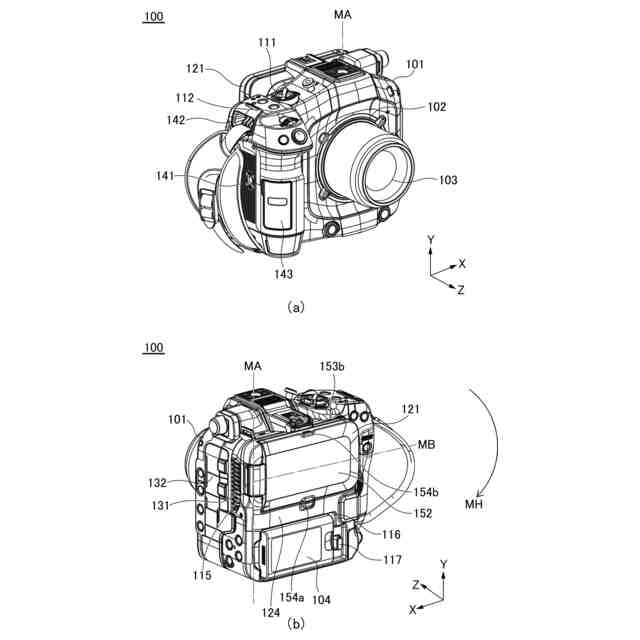 図1は実施形態に係る撮像装置100の外観斜視図であり、図1(a)と図1(b)とでは撮像装置100を見る方向が異なっている。説明の便宜上、図1に示すように三次元直交軸(XYZ)を定める。Z軸は,撮像装置100の内部に装備された撮像素子(不図示)の撮像面と直交(撮像光軸と平行)であり、撮像装置100から被写体(不図示)に向かう方向を正方向(+Z)とし、その逆を負方向(-Z)とする。X軸は、撮像装置100の幅方向と平行であり、撮像装置100の前方(+Z側)から見て左から右に向かう方向を正方向(+X)とし、その逆を負方向(-X)とする。Y軸は、撮像装置100の高さ方向と平行であり、撮像装置100の下面から上面に向かう方向を正方向(+Y)とし、その逆を負方向(-Y)とする。なお、図1及び後述する図2に示される撮像装置100の姿勢(X軸とZ軸が水平面と平行で、+Y方向が天を向く姿勢)を正姿勢と称呼する。