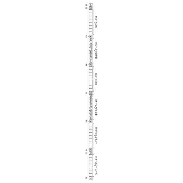 図1に示す通信プロトコルでは、スタートコンディション1、ターゲットアドレス2、データ書き込みを示す信号3、肯定応答4、CRCコード(CRC値)5、肯定応答6、レジスタアドレス7、肯定応答8、CRCコード9、肯定応答10、書き込みデータ11、肯定応答12、CRCコード13、肯定応答14、及びストップコンディション15の順で信号が伝送される。