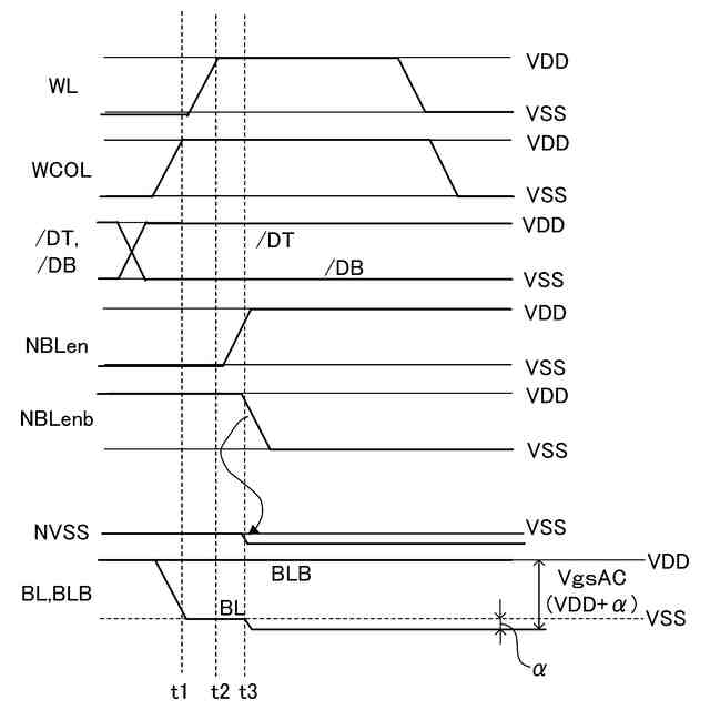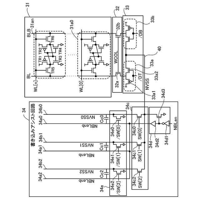 書き込みアシスト回路のアシスト方式として、ビット線の電位を負電位まで下げることでメモリセルへの書き込みを補助する、ネガティブビットライン(NBL:Negative Bit Line)方式がある。たとえば、容量素子によりアシスト量を調整可能とするNBL方式の書き込みアシスト回路や、面積の増大を防ぐために容量素子ではなく、寄生容量である配線間容量を利用したNBL方式の書き込みアシスト回路がある。