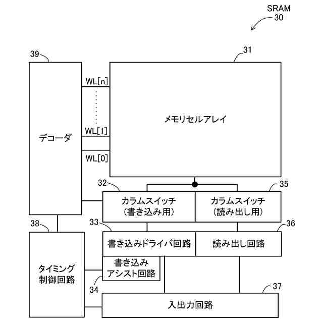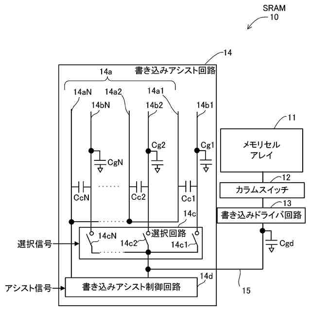 また、1つの実施態様では、第1ビット線と第2ビット線に接続されたメモリセルを含むメモリセルアレイと、前記メモリセルに対する書き込み時に、前記第1ビット線と前記第2ビット線に互いに異なる電位を印加する書き込みドライバ回路と、前記書き込みドライバ回路に接続する書き込みアシスト回路と、を有し、前記書き込みアシスト回路は、第1配線と、前記第1配線により負電位方向のノイズを受ける複数の第2配線と、入力される選択信号に基づいて、前記複数の第2配線から、第1の数の第2配線を選択し、前記ノイズにより前記第1の数の第2配線に印加された負電位に基づく負電位量の電位を、前記書き込みドライバ回路に対して出力する選択回路と、を有するSRAMが提供される。