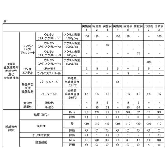 本発明の1液型金属接着用熱硬化性液状樹脂組成物には、熱分解型の有機過酸化物とウレタン(メタ)アクリレートを含むため、常温では1液で使用することができ、加熱後には迅速に硬化できるものと考えられる。また、ウレタン(メタ)アクリレートのアクリル当量が1000~4000g/eqであるため、樹脂組成物は低粘度でありながら、硬化物は柔軟となるものと考えられる。また、本発明の1液型金属接着用熱硬化性液状樹脂組成物は、リン酸エステルを含むため、金属との密着性や接着後の強度に優れ、金属接着用の樹脂組成物として有用であると考えられる。