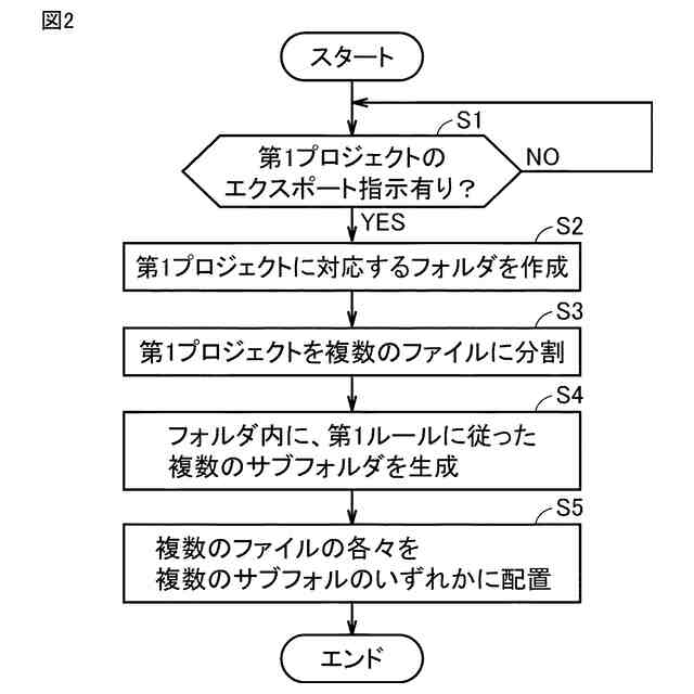 第1プロジェクトのエクスポート指示を受けたことに応じて、前記第1プロジェクトに対応する第1フォルダを生成することを実行するエクスポート部と、