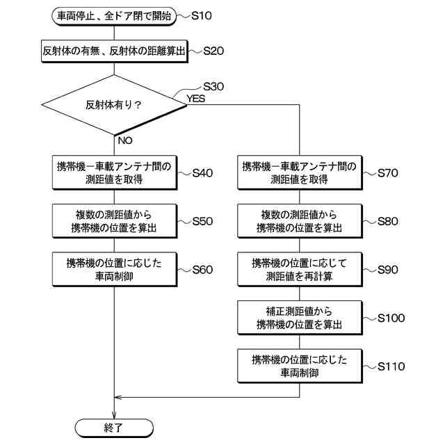 複数の前記車載アンテナと前記携帯機との間でそれぞれ測距した複数の測距値を用いて算出した前記携帯機の位置が、前記車両から見て前記反射体よりも近い場合、その算出された前記携帯機の位置を正しい位置と判定して前記車両の制御を行い、