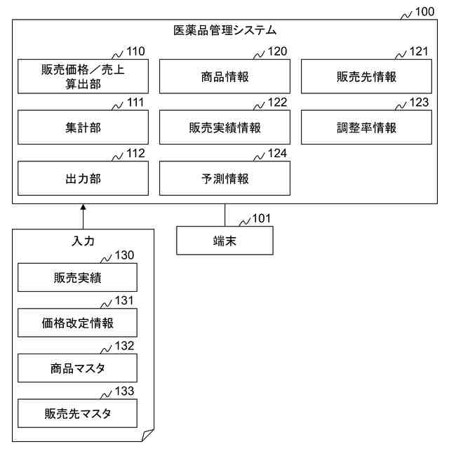 医薬品の販売先を管理するための販売先情報と、前記医薬品の販売実績を管理するための実績情報と、前記販売先の特徴に基づいて設定され、前記医薬品の販売価格を調整するために用いる指標を管理するための調整指標情報と、を保持し、