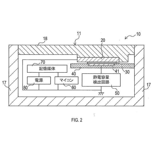 図1~3を参照して、本実施形態に係る電子制御装置10の構成について説明する。電子制御装置10は、略直方体形状を有する。電子制御装置10は、例えば、車両に搭載され、車両の所定の機能を制御する。電子制御装置10は、筐体11と、電子基板40と、静電容量検出回路50と、マイクロコンピュータ(以下、マイコン)60と、リード端子61と、記憶媒体70と、電源80と、対向部20と、中間部30と、配線パターン41と、グランド42と、を備える。