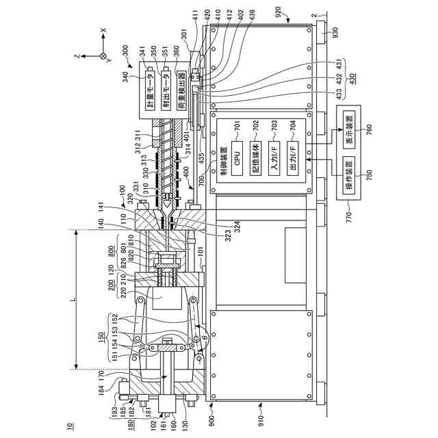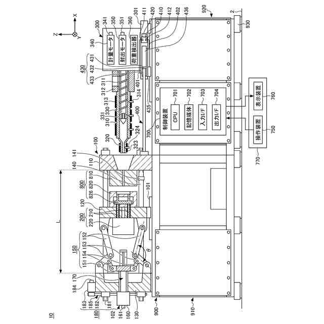 ノズル320の前端は、固定金型810に接触する。固定金型810と可動金型820とで金型装置800が構成される。型締時に、固定金型810と可動金型820の分割面にキャビティ空間801が形成される。キャビティ空間801は、成形品(製品)を成形する空間である。また、固定金型810には、スプルー空間802が形成される。