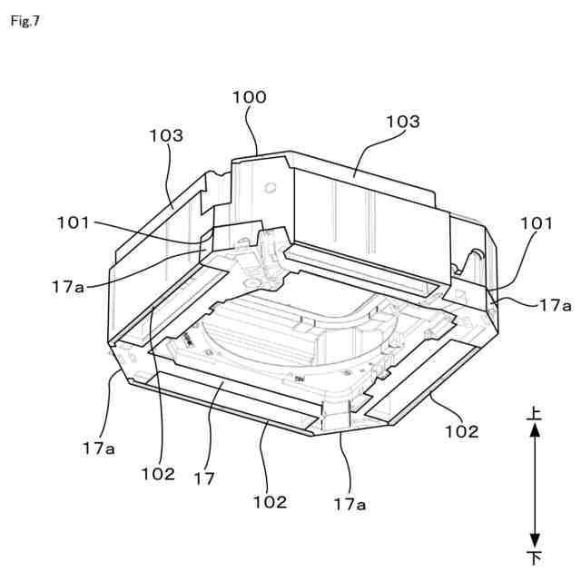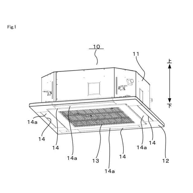 化粧パネル12は、概ね矩形の板状に形成されている。化粧パネル12には、空気吸込口13及び空気吹出口14が設けられている。空気吸込口13は、化粧パネル12の中央部において概ね正方形状に形成されている。空気吸込口13は、通気可能に格子状に開口した、いわゆる吸込グリルとして構成されている。空気吹出口14は、空気吸込口13の各辺に沿う長尺な開口を形成している。空気吹出口14には、当該空気吹出口14から吹き出される風の向きを調整するルーバ14aが回動可能に設けられている。