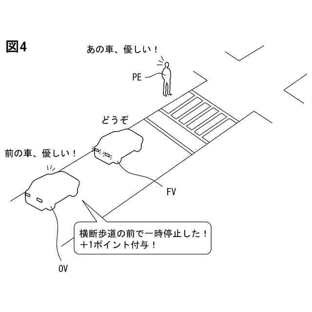 これによれば、自車で判定した、自車の適切な運転行動に応じた評価得点について示す表示が、他車両の乗員に確認できるようになる。よって、自車の運転者にとっては、評価得点について示す表示によって、自車の適切な運転行動を他人に知ってもらうことになる。従って、自車の運転者は、他人から認められるという承認欲求が満たされやすくなる。また、適切な運転行動により承認欲求が満たされることから、自車の運転者が自発的に適切な運転行動をとりやすくなる。その結果、運転者に抵抗感を感じさせにくようにしつつ、運転者をより適切な運転行動に誘導することが可能になる。