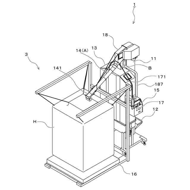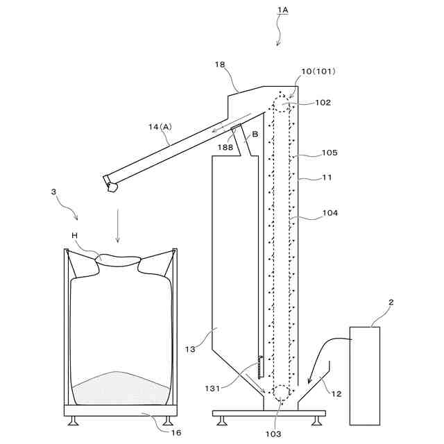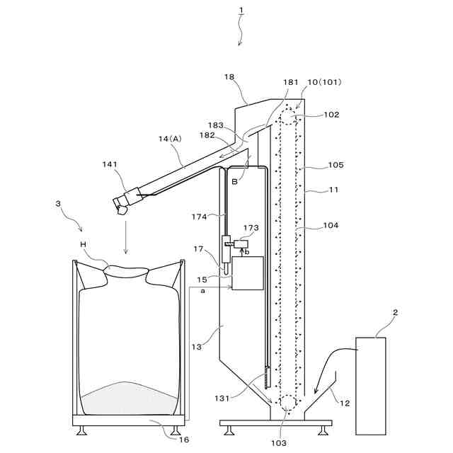 従来から、穀物や土砂などの粉粒状物を梱包・輸送するためにフレキシブルコンテナバッグと呼ばれる袋状体が用いられている。穀物に限って言えば、特に、小さな農家にとっては、通常、30kgの穀物専用の梱包袋を用いるのが多いが、処理効率の観点から、収容量が1トン程度の大型のフレキシブルコンテナバッグを用いるシステムも存在していた。しかしながら、これらの大型の揚穀機においては、フレキシブルコンテナバッグの下に計量機を配置し、フレキシブルコンテナバッグの上には大型のホッパーを配置し、その上から昇降機で揚穀した穀粒を落とし入れるために、全体の高さが4m近くから5mに達する装置もあった。