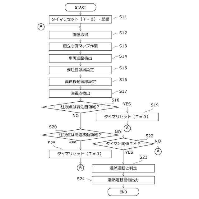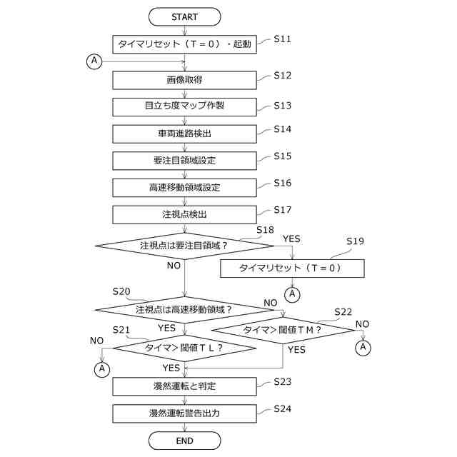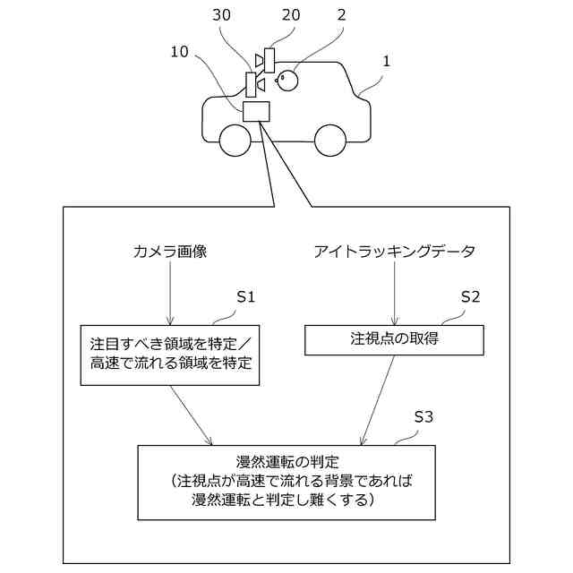 人間には、速く動く物体に目が行くという習性がある。例えば、自車両が高速で走行している場合は近景ほど速く流れるところ、それにつられて視線の先(視点)が速く動く部分に滞留することがあった。また、人間が注視すべき対象を確認する場合は、対象に視点を長時間合わせるのではなく、視点が滞留している地点から対象へ大きく移動させ、対象に視点を合わせる時間は比較的短いことが多い。これは、人間の習性として起こる現象であるが、仮に視点が注視すべき対象に位置するか否かにより漫然運転を判定した場合、注視すべき対象が特に無い滞留領域に長時間視点が位置する状態、注視すべき対象がある地点に短時間しか視点が位置しない状態が比較的多く発生し易いため、誤判定が生じるという問題があった。