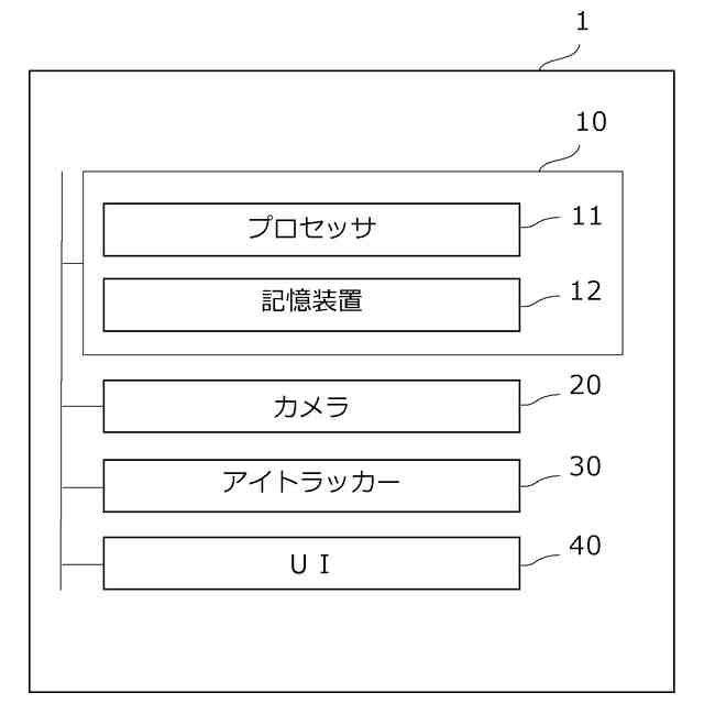 以下、図面を参照しつつ実施形態について説明する。図1は、実施形態の概要を説明するための図である。本実施形態に係るシステムは、車両1に搭載される車載装置10、カメラ20、アイトラッカー30を含み、運転者2の漫然運転を検知する。カメラ20は、例えばドライブレコーダ等の撮像装置であり、車両1が前進する方向を撮像する。アイトラッカー30は、車両1の運転者2の視線検知を行う視線計測装置である。