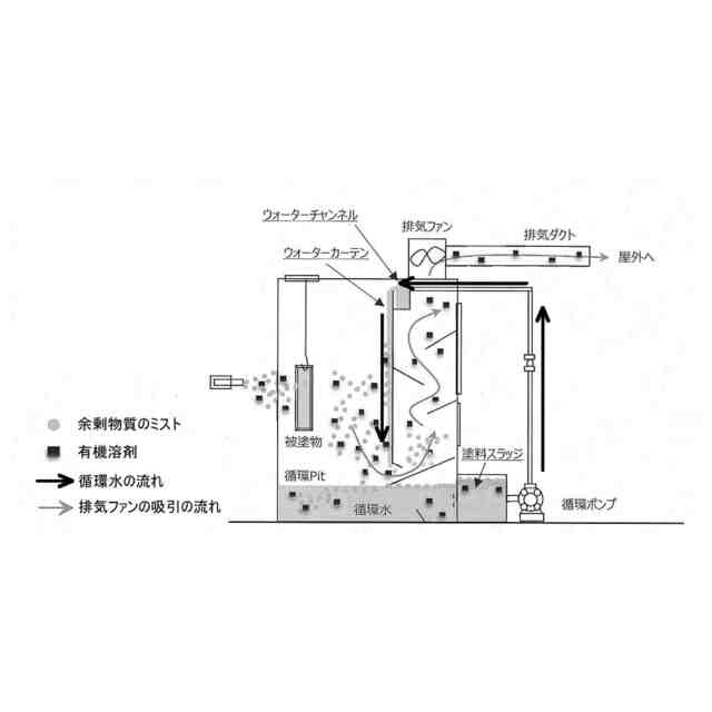 自動車等の塗装には、例えば図1に示したように、湿式塗装ブースを用いたスプレー塗装が行われており、その際に、塗装に用いられなかった余剰物質(未着塗料、オーバーミスト)が大量に発生する。