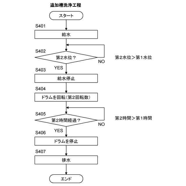 前記制御部は、前記追加槽洗浄工程において、給水装置からの給水により前記外槽内に前記槽洗浄工程よりも多くの水を溜める、および/または、前記ドラムが回転する動作時間を前記槽洗浄工程よりも長くする、