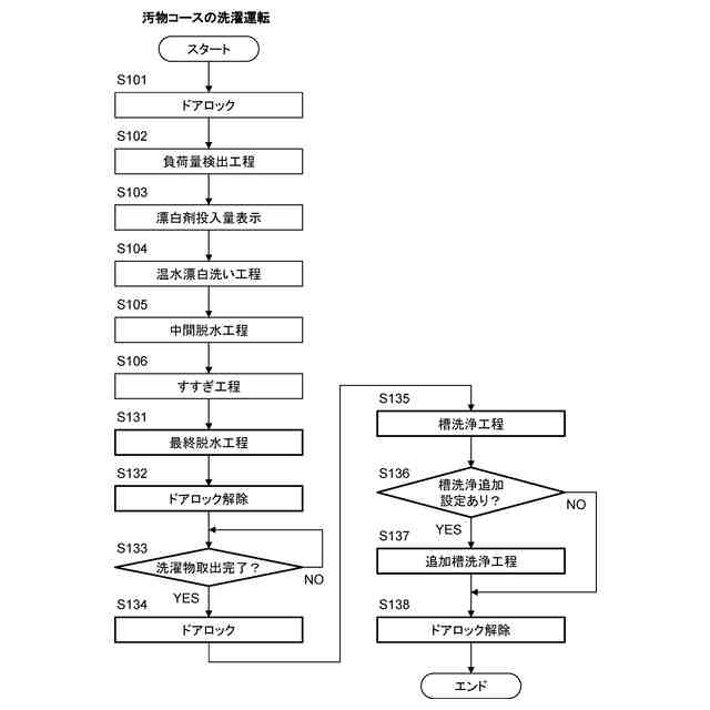 【解決手段】ドラム式洗濯機1は、筐体10内に配置され、水が溜められる外槽20と、外槽20内に、水平軸周りに回転可能に配置され、洗濯物が収容されるドラム23と、外槽20内に溜められた水を加熱するヒータ60と、汚物が付着した洗濯物を洗濯可能な洗濯運転を実行する制御部と、を備える。制御部は、前記洗濯運転において、ドラム23を回転させて、漂白剤を含みヒータ60で加熱された水によりドラム23内の洗濯物を洗う温水漂白洗い工程を実行し、当該温水漂白洗い工程よりも後に、水が溜められた外槽20内でドラム23を温水漂白洗い工程よりも高い回転数で回転させることにより外槽20の内壁面を洗う槽洗浄工程を実行する。