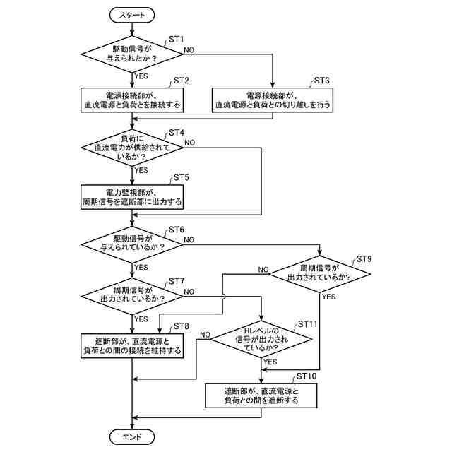 遮断部が、前記駆動信号が前記電源接続部に与えられているときに、前記電力監視部から周期信号が出力されたときは、前記直流電源と前記負荷との間の接続を維持する一方、前記駆動信号が前記電源接続部に与えられていないときに、前記電力監視部から周期信号が出力されたとき、又は、前記電力監視部から自己が故障している旨を示す信号が出力されたときは、前記直流電源と前記負荷との間を遮断する