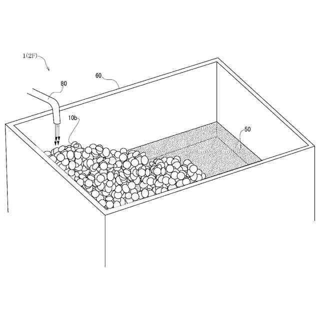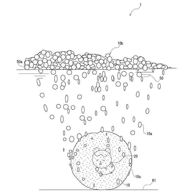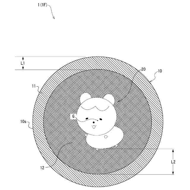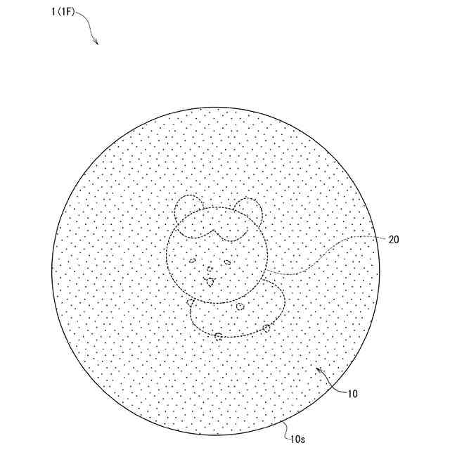 固形入浴剤1は、図1に示すように第1形態1Fにおいて、略球形状で水溶性の主体部10と、第1形態1Fにおいて主体部10に内包された副体部20と、を備えている。特定のキャラクターを模した副体部20は、水に溶ける固形の主体部10に保持されていることで、溶液である例えば浴湯50(図3参照)に投入されたときに、主体部10が溶解して副体部20が現れる(この状態が第2形態2F)構成となっている。