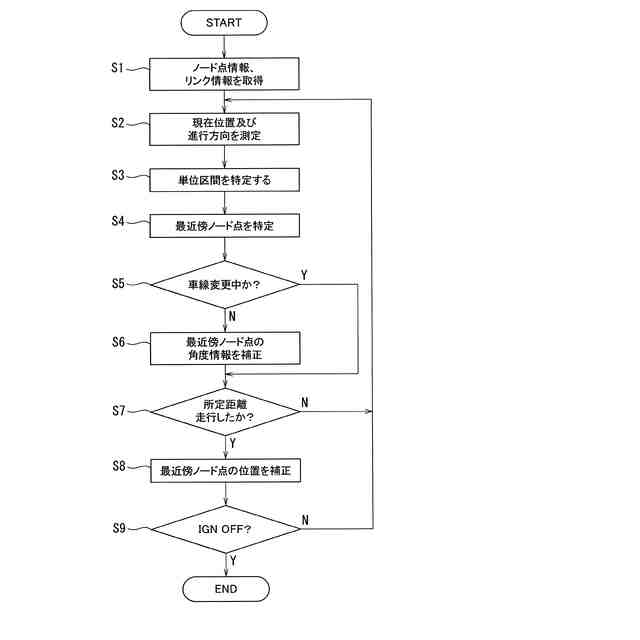 測定された前記現在位置及び進行方向とに基づいて前記地図ノード点及び前記地図リンク線を補正し、