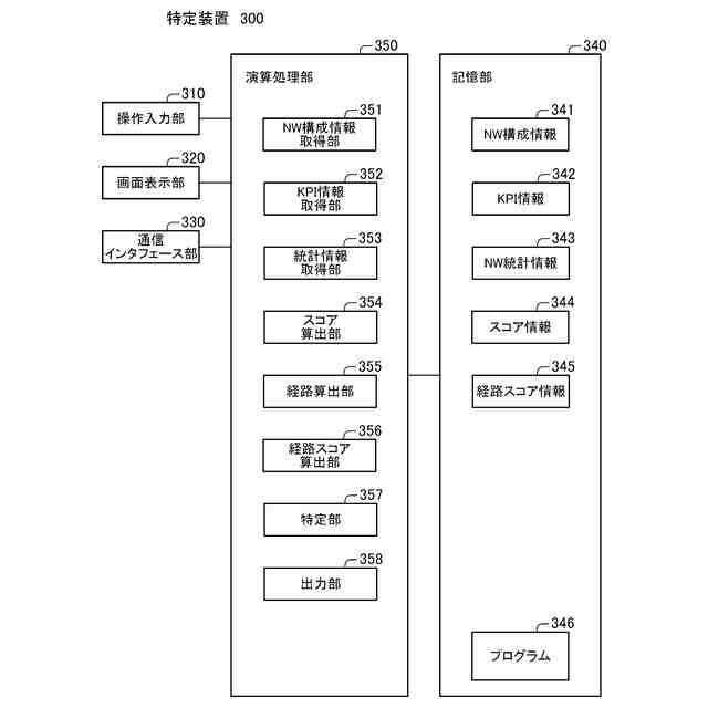 【解決手段】特定装置は、複数の通信を行うネットワークを構成する中継装置ごと、または、中継装置のポートごとにおける、サービスの評価指標に対する影響度合いを示すスコアを用いて、ネットワークにおいて各通信が経由する経路をそれぞれ算出する経路算出部と、経路算出部が算出した経路の重なり具合に応じて、評価指標に対して影響を与える原因となる中継装置または中継装置のポートを特定して特定結果を出力する特定部と、を有する。