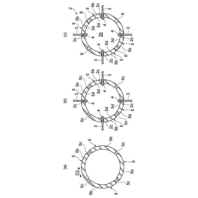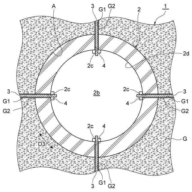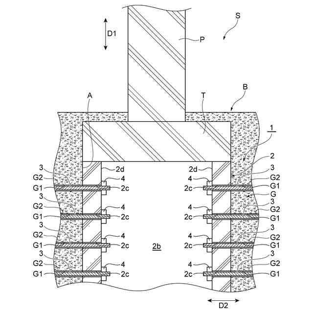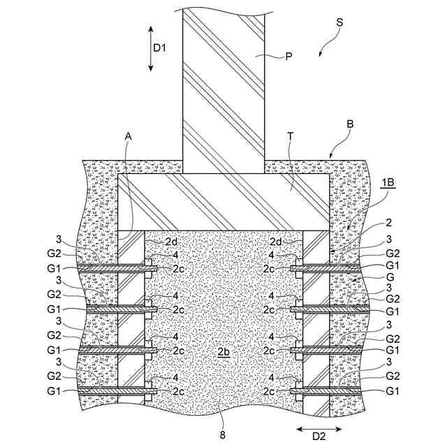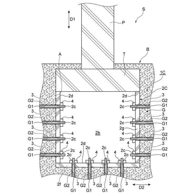 (3)上記(1)または(2)において、鉄筋コンクリートは、複数の定着体が配置される内部空間が形成された筒状を呈してもよい。この場合、鉄筋コンクリートを中空とすることができるので、鉄筋コンクリートが中実である場合と比較して鉄筋コンクリートの使用量を低減させることができる。