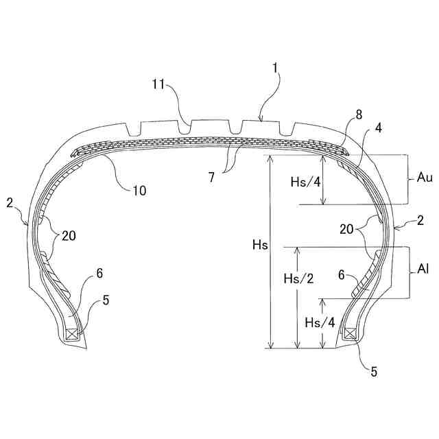本発明において、サイド部の上端位置からサイド部の断面高さの0%~25%となる上側領域にシーラント層の少なくとも一部が配置されていることが好ましい。また、サイド部の下端位置からサイド部の断面高さの25%~50%となる下側領域にシーラント層の少なくとも一部が配置されていることが好ましい。サイド部の上側領域及び下側領域は例えば縁石乗り越し時にカット傷が発生し易いので、当該箇所にシーラント層の少なくとも一部が配置されることにより、最小限のシーラントで効率的にエア漏れを抑制することができる。