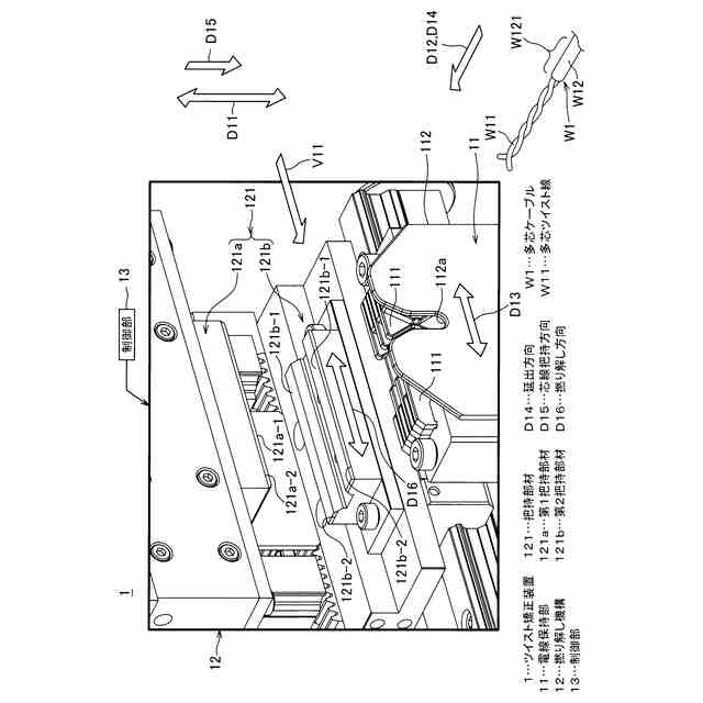 【解決手段】ツイスト矯正装置1が、一対の把持部材121に多芯ツイスト線W11を把持させ、撚り解し方向D16について一対の把持部材121に相対的な往復位置ずれ動作を行わせつつ、一対の把持部材121を多芯ツイスト線W11の先端側へと一緒にスライドさせることで撚り解しを行う撚り解し機構12と、一対の把持部材121が露出側端部側に位置しているときには、先端側に位置しているときよりもツイスト把持方向D15の把持力、及び往復位置ずれ動作における動作力と位置ずれ量が小さくなるように動作制御を行う制御部13と、を備えたことを特徴とする。