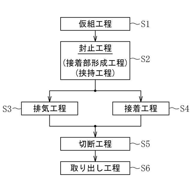 【解決手段】ガラス板を含む複数枚の板材を重ね合わせた仮積層体2を含む仮積層集合体3を、第一シート材1と第二シート材10との間に挟む仮組工程S1と、第一シート材1と第二シート材10とを仮積層集合体3の周りの封止予定線M1~M4に沿って封止して密封状態の袋にする封止工程S2と、を備え、封止工程S2は、封止予定線M1~M4の少なくとも一部について、第一シート材1と第二シート材10とを挟持治具17で挟持して挟持部18を形成する挟持工程を備える。