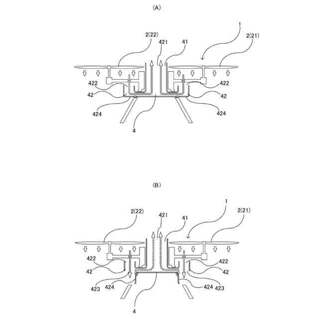 (1)上記課題を解決するために、本発明に係るマルチコプターは、複数のプロペラを備え、その一端が前記複数のプロペラより低い位置に配置され、その他端が前記複数のプロペラ以上に高い位置に配置された通気管を備えた、ことを特徴とする。