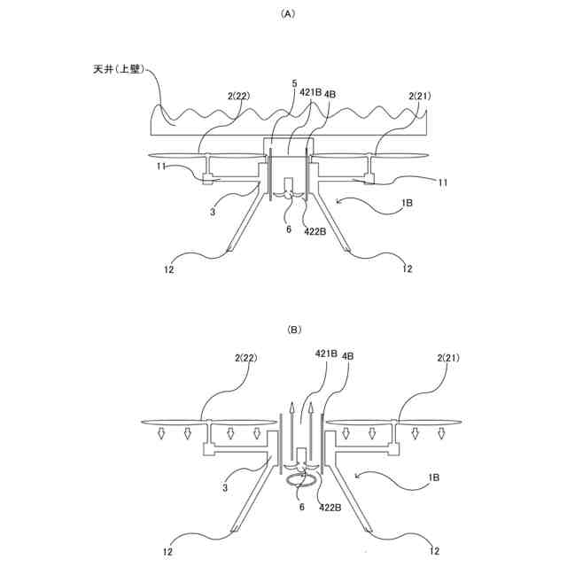 上述したように、特許文献1の飛行体(マルチコプター)では、回転翼(プロペラ)に形成された貫通孔である圧力回復孔によって、天井とプロペラとの間と、プロペラの下側との間の圧力差を軽減させて、吸い付き効果の発生を防止している。しかしながら、単に貫通孔を形成する構成では、貫通孔のサイズと位置がプロペラのサイズと位置に制約を受けてしまい、天井とプロペラとの間への空気の供給量と供給位置が、吸い付き効果の発生を防止したり、解消するのに不十分である場合がある。また、プロペラに貫通孔を形成するため、プロペラの形状の設計の自由度も小さくなる。