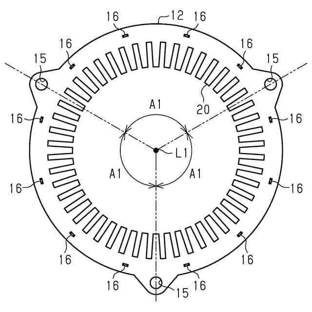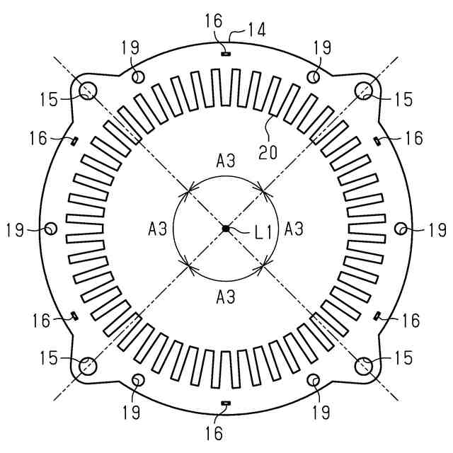 前記第1カットコアプレートのダボと貫通孔とは、それらの前記領域内での合計数が奇数であり、且つ、前記中心線周りに等しい角度間隔をおいて交互に形成されており、