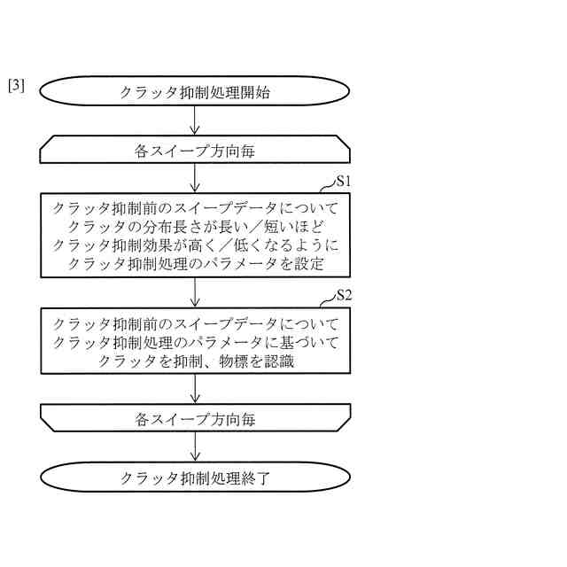 前記課題を解決するために、海面の波が高い/低い又は雨雪が強い/弱い状況では、「クラッタ抑制前」のスイープデータについて、クラッタの「分布長さ」がそれぞれ長い/短いことに着目した。そこで、「クラッタ抑制前」のスイープデータについて、クラッタの「分布長さ」が長い/短いほど、クラッタ抑制効果がそれぞれ高く/低くなるように、クラッタ抑制処理のパラメータを設定し、クラッタを抑制し、物標を認識する。