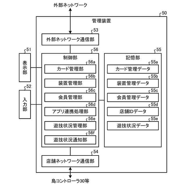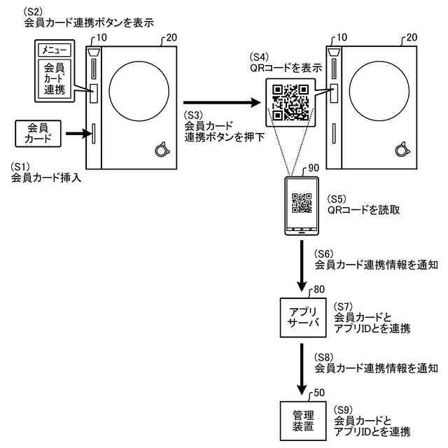 【解決手段】台間カード処理機10に会員カードが挿入されたならば(S1)、会員カード連携ボタンを表示する(S2)。会員カード連携ボタンが押下されたならば(S3)、店舗ID、台間カード処理機ID、カードIDを含むQRコード(登録商標)を表示する(S4)。携帯端末90でこのQRコード(登録商標)を読み取ったならば(S5)、会員カード連携情報をアプリサーバ80に通知する(S6)。アプリサーバ80は、会員カード連携情報を受信したならば、会員カードとアプリIDとを連携し(S7)、会員カード連携情報を管理装置50に通知する(S8)。管理装置50は、会員カード連携情報を受信したならば、会員カードとアプリIDとを連携する(S9)。