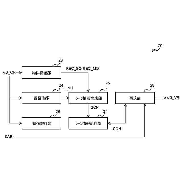 【解決手段】処理回路は、カメラ映像に対する物体認識処理によってカメラ映像に映る物体の認識情報を生成する。処理回路は、また、カメラ映像に対する言語化処理によってカメラ映像に映るシーンの言語情報を生成する。処理回路は、また、人物の認識情報と、シーンの言語情報とを関連付けたシーン情報を生成して記憶装置に格納する。処理回路は、更に、シーン情報に基づいて、カメラ映像に映るシーンの再現処理を行う。再現処理では、カメラ映像に映る空間の抽象化画像がレンダリングされ、この空間の抽象化画像上に人物の抽象化画像がレンダリングされる。再現処理では、また、空間の抽象化画像に、言語情報から生成されたキャプション情報が追加されて再現画像が生成される。